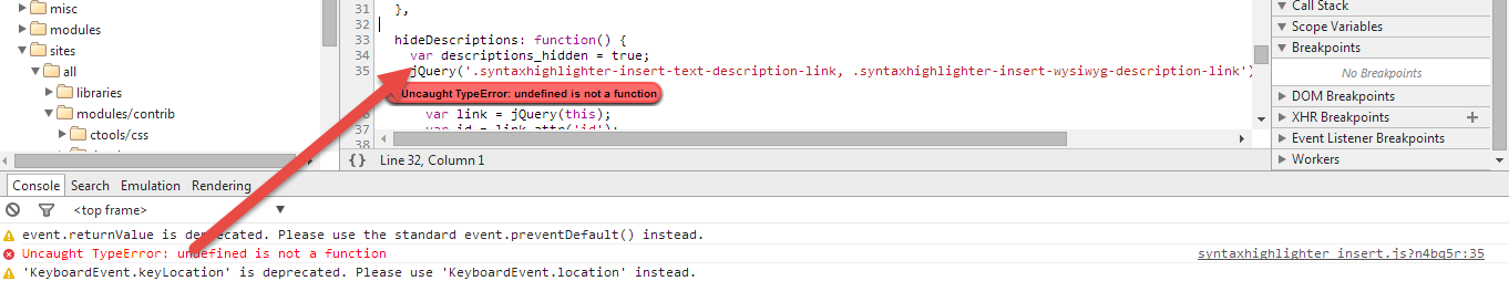 After enabling jQuery Update module, the Syntaxhighlighter Insert throws error and does not work.