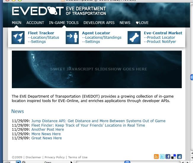 To further beef up Drupal skills and just have fun, I'm making a site for the MMORG EVE-Online with tools and such you can use in the game. The game has its own web browser, a new one in fact released today built around Google Chome's engine (if I remembered correctly). The browser integrates with game data like your current location in the game, making this way fun!